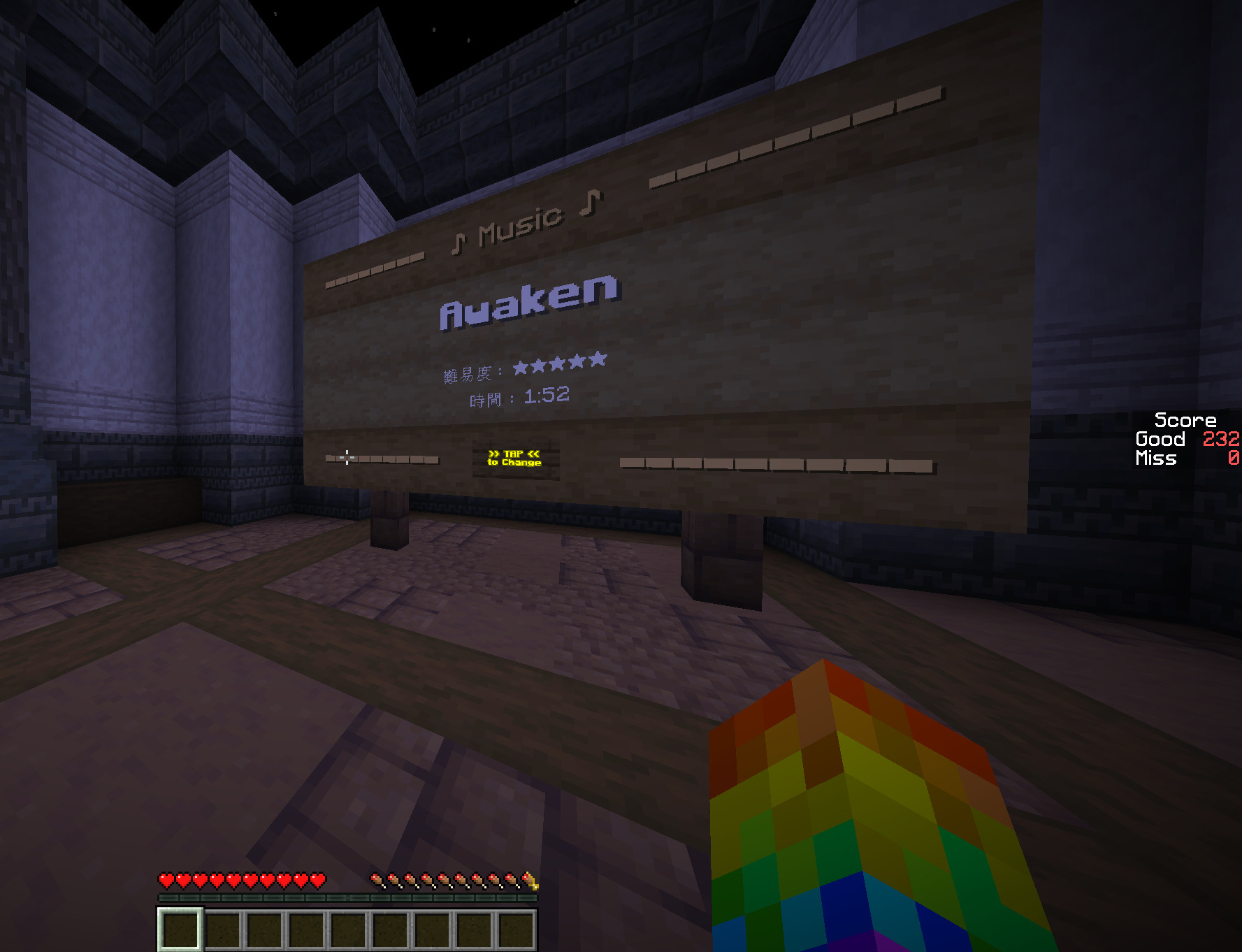 ※ノーツが見えなくなる不具合についてときどきノーツが1列だけ見えなくなったりします。1度リタイアしたり、ワールドに入り直したり、時間が経ったりすると、なぜか直ります。今の知識では直せそうにありませんでした。ご了承ください。m(__)m対策として、景観は損ないますが、F3+Bで当たり判定を表示させると、ノーツの判定だけは見えるようになります。↓↓↓