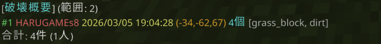• 破壊と設置の直近の3つだけじゃなくもっと見れる様になれたな!と思います!後ついでになのですが、チェストログを見る時に何を盗ったか入れたかを分かる様にするには出来ますか!?