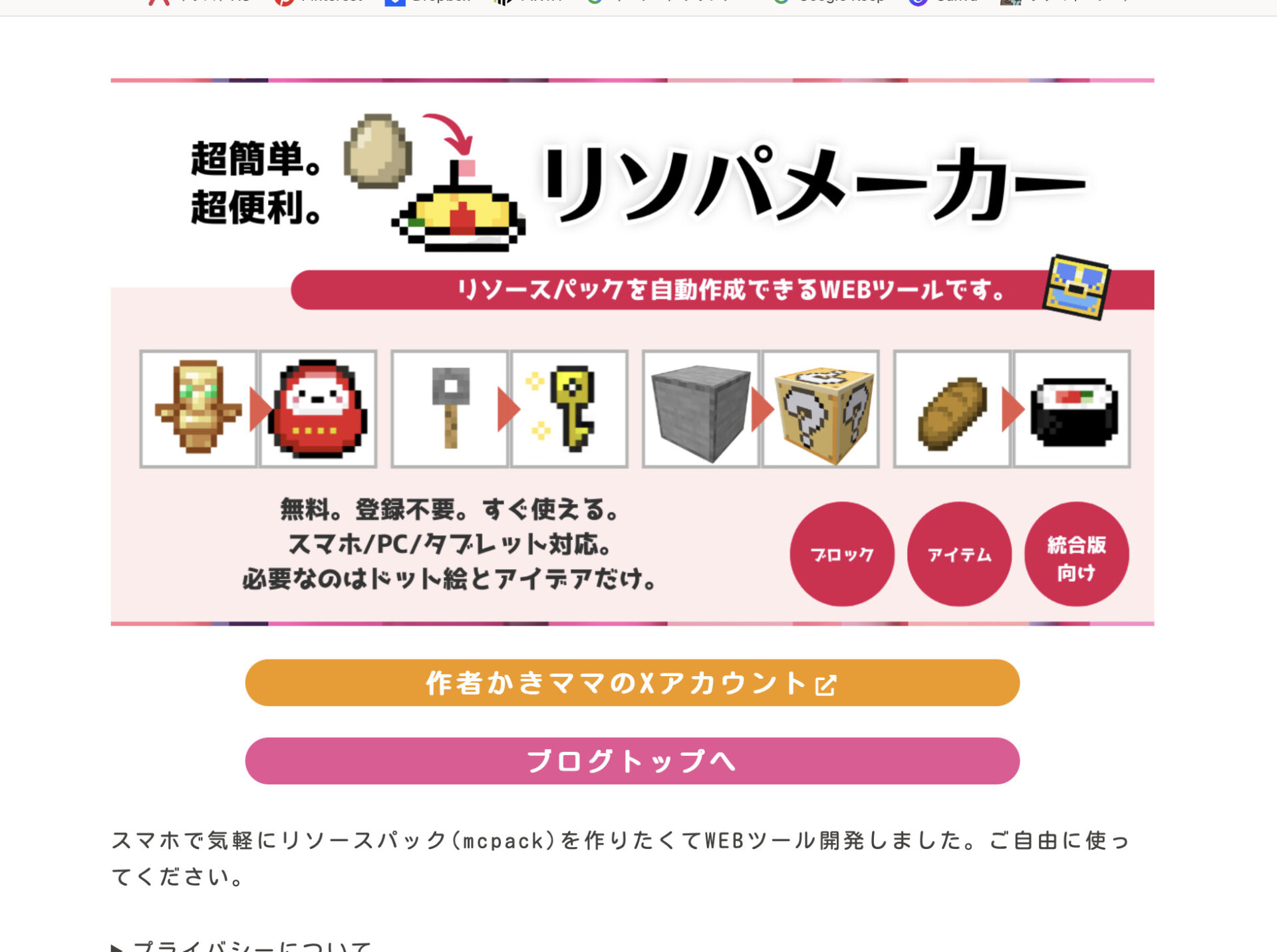 作者かきママのXアカウントブログトップへスマホで気軽にリソースパック(mcpack)を作りたくてWEBツール開発しました。ご自由に使ってください。プライバシーについてこのツールはすべての処理をあなたのブラウザ内で実行します。アップロードされ...