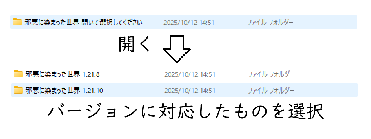 2025/10/12 フォルダー名を”邪悪に染まった世界 1.21.8~1.21.10″から”邪悪に染まった世界 開いて選択してください”に変更しました。
