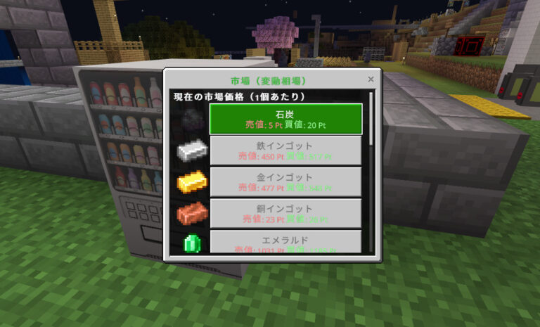 サーバー内には独自の通貨が存在し、鉱石や作物を売買できます。市場の価格はプレイヤー全員の需給バランスによってリアルタイムに変動。賢く立ち回り、富を築き上げる楽しさも体験できます。うまくやれば儲けられます(笑)