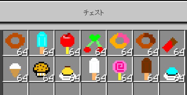 このリソースパックは板材や石系ブロックなどをお菓子の見た目に変えるリソースパックです。食べ物の見た目もお菓子に変わります。アイテム名はそのままなので名前も変えたかったら金床を使って変えてください。全体的にオレンジっぽくなります。