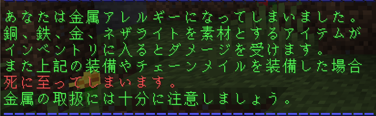 データパックを入れると、鉄、銅、金、ネザライト製のアイテムを持つとダメージが入るようになります。また、上記、装備やチェーンメイルを装備してしますとキルされます。