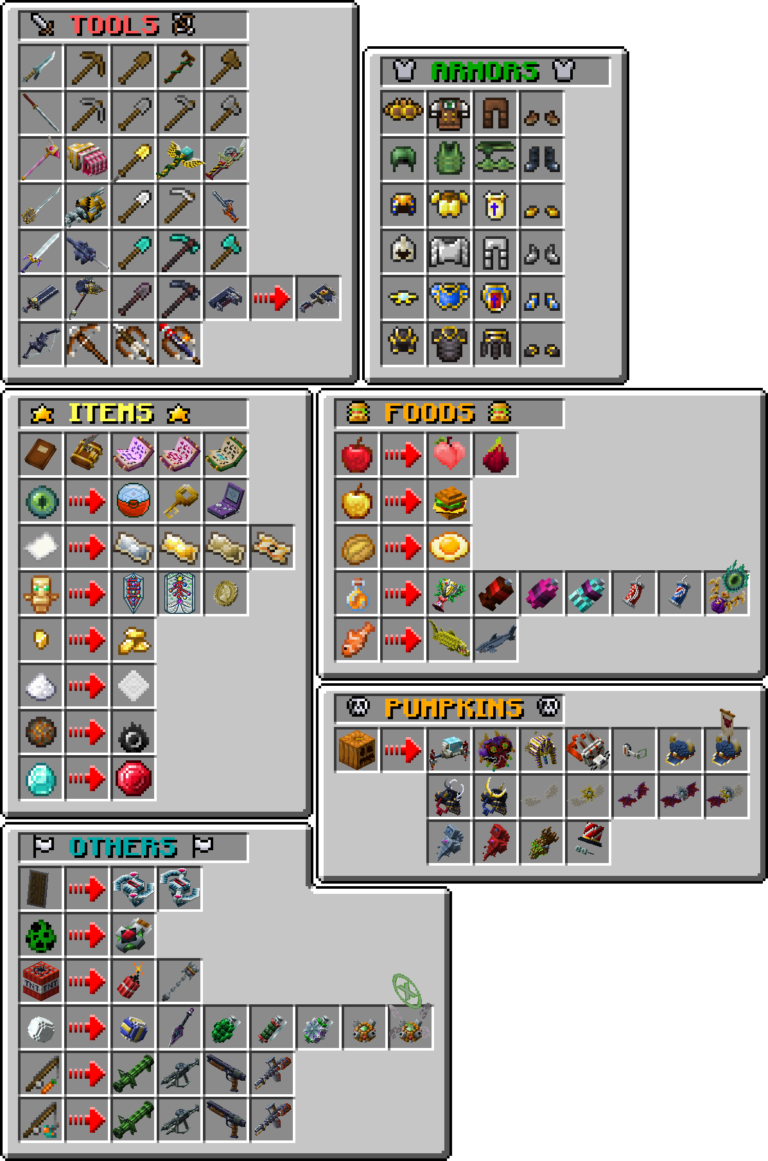 完全クリエ用にしようとも考えましたが、せっかくなのでサバイバルでも遊べるように一部のアイテムは、バニラアイテムに置き換えています。