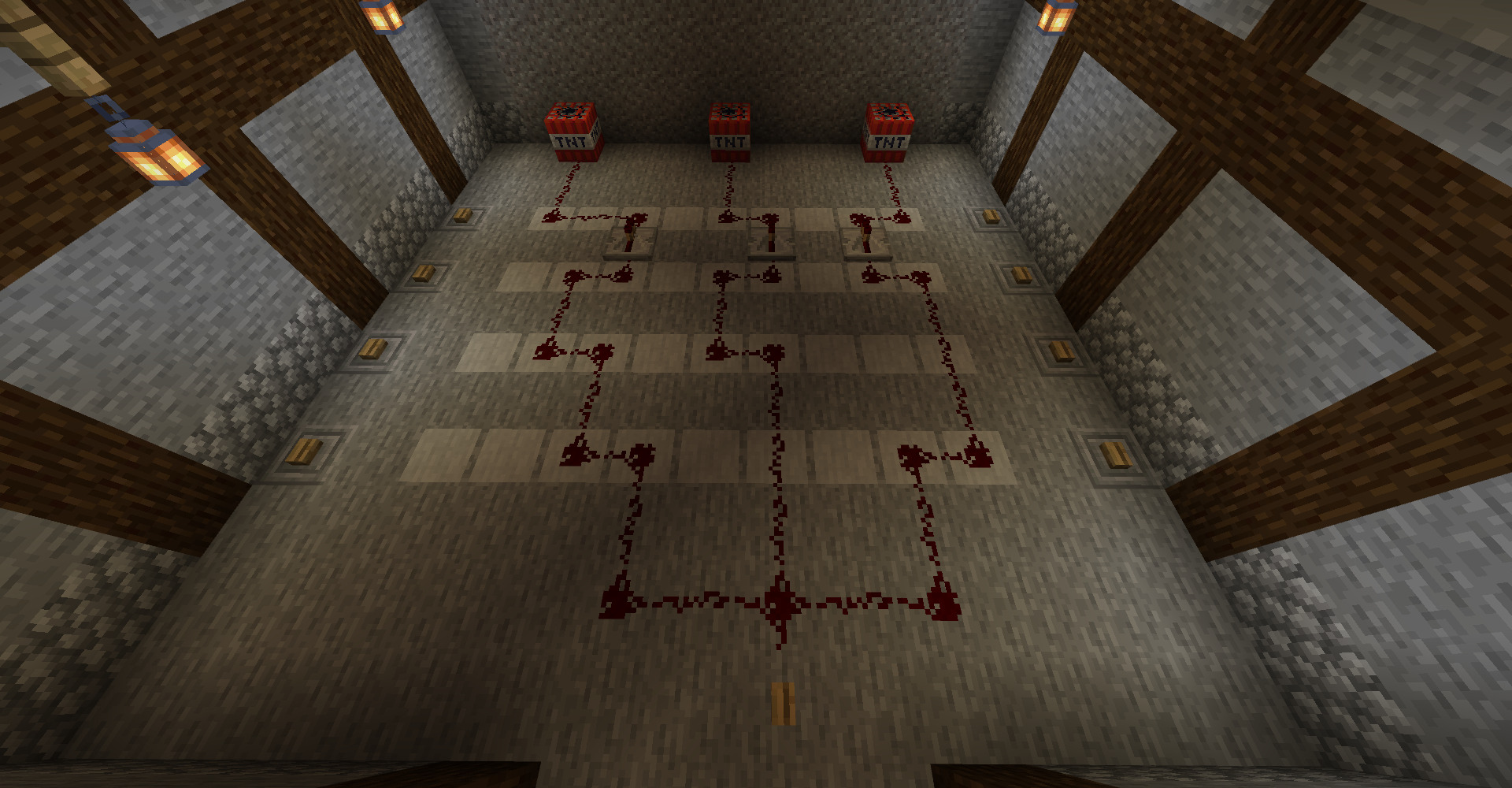 3つのTNTを同時に着火する必要があります。TNTに近い導火線から繋げていくと、答えにたどり着きやすいですよ。