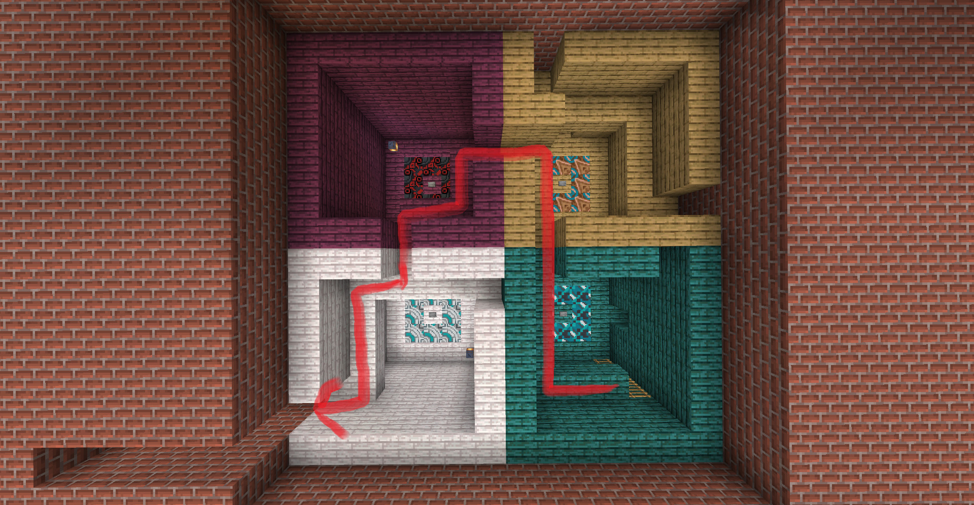 白い部屋の上階の角にゴールがあります。そこにたどり着くためには、4つの部屋の上の通路をつなげる必要があります。