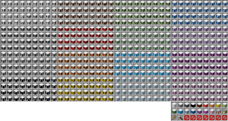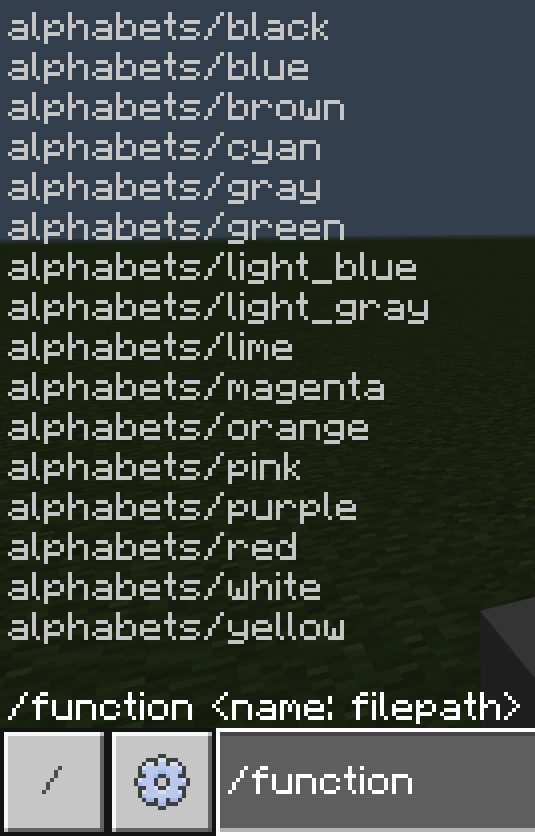 今回追加するブロックが各色かなり多いので、全部クリエイティブメニューに並べるとごった返してわけわからんことになるんですね。なので無地ブロック以外は、刻印またはコマンドでのみ入手できるようになっています。全文字一気に欲しければ、/functionが便利です。