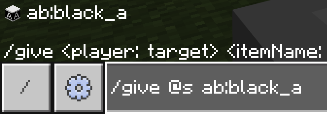 個別では、/give (対象) ab:(色)_(文字) (個数)で入手できます。自分に黒のAが16個欲しければ、/give @s ab:black_a 16ですね。アドオン追加のアイテムは、アルファベットに限らず:の前に名前空間というものがあります。今回だったらab:ですね(レンチだけはbc:ですが)。名前空間はアドオンの名前だった離製作者の名前だった離アイテムのグループ名だったり色々ですが、絶対にあります。この特性は覚えておくといいかも。
