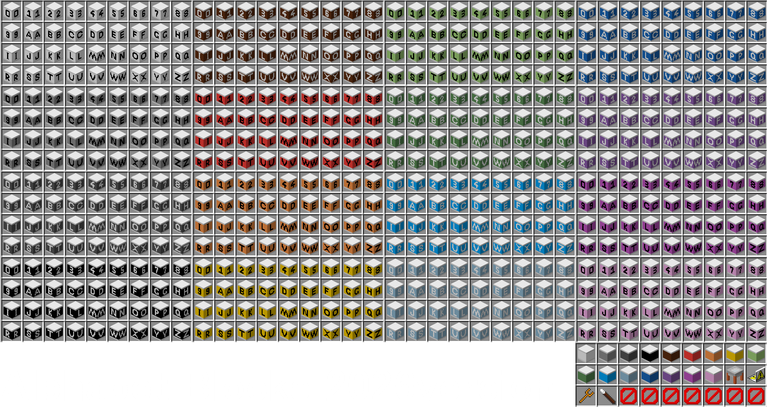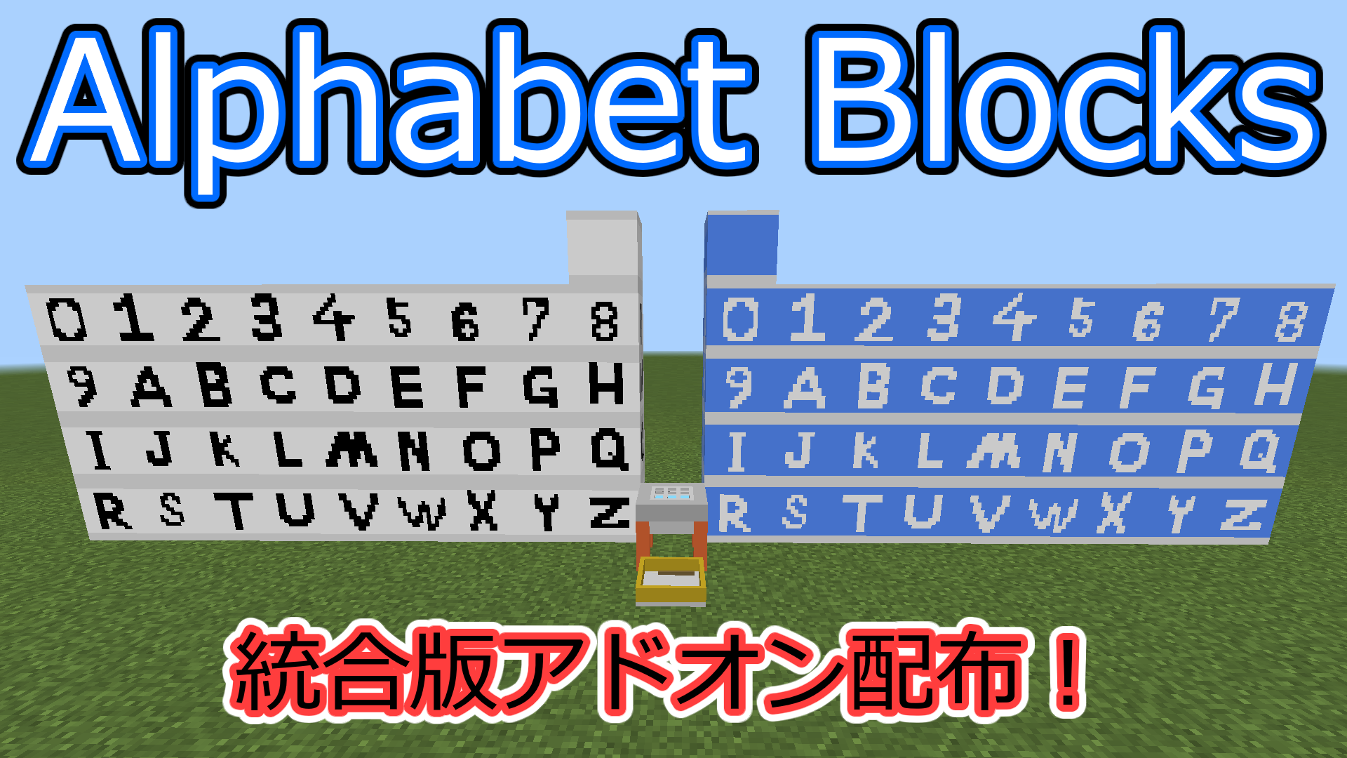 こちらは2023年に配布した、「Alphabet Blocks」の紹介動画のサムネイルです。このときは青と白、2色でフォントもガタガタなアドオンでした。追加されるブロックは見えているもので全てです。そして例の如く、2024年8月のマイクラアップデートにより、完全に使い物にならなくなったアドオンでもあります。