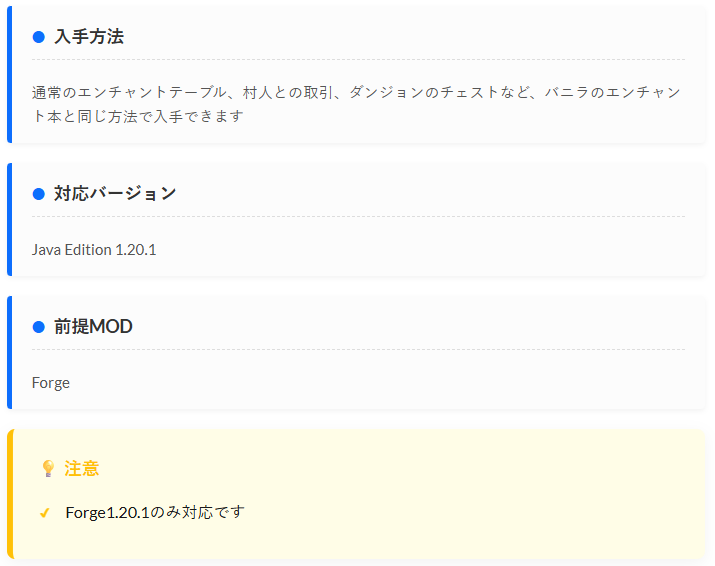 一部のエンチャントはその仕様上、他のエンチャントと競合するように設定しています。以下では、追加されるエンチャントの詳細を解説していきます: