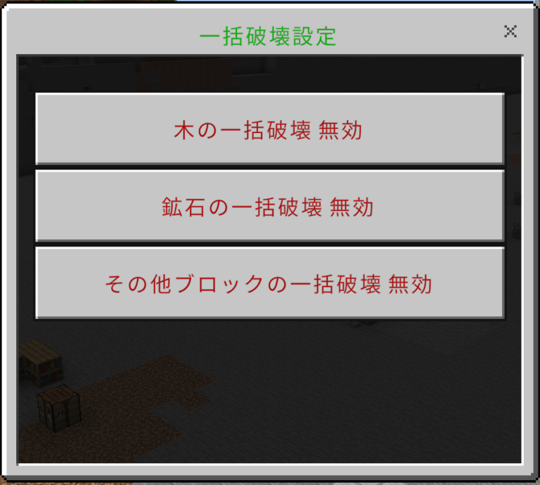 ワールドに入ると一括破壊設定というアイテムが付与されます。(このアイテムは死亡しても無くなりません)