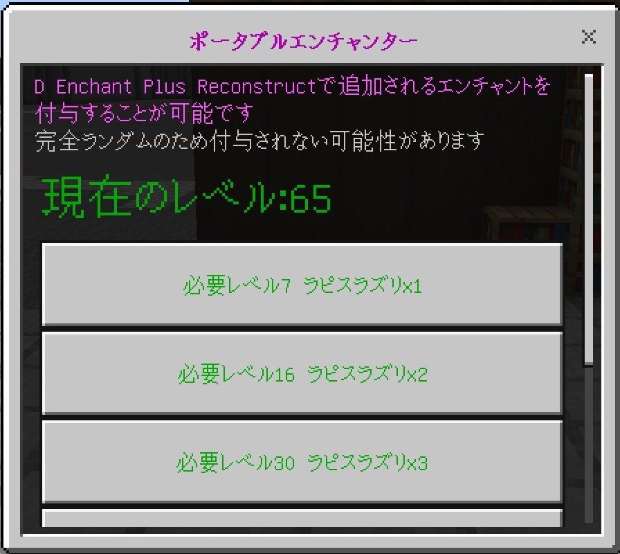以前投稿したエンチャント追加アドオンが重くてマルチで使用しにくかったり、そもそも使えないというようなことがあったため、再構築しました!軽量化をある程度重視したので以前よりは軽いと思います!(自信はないけれど)軽量化の関係で一部エンチャントは引継ぎされていませんが、新たにエンチャントが増えています!
