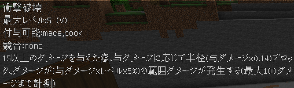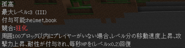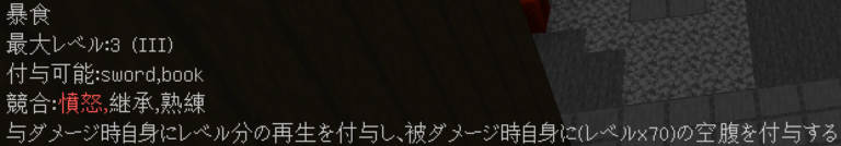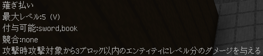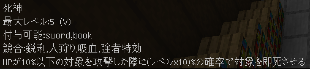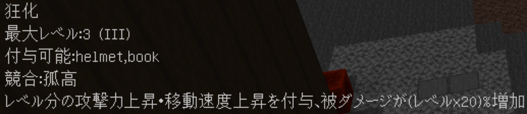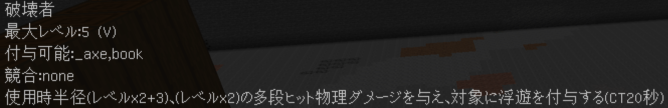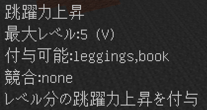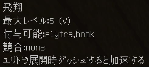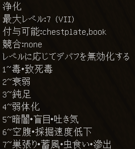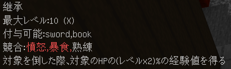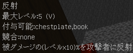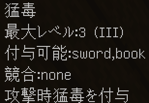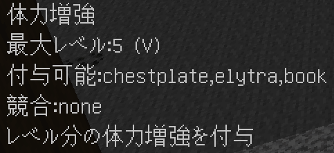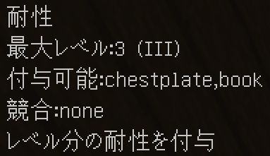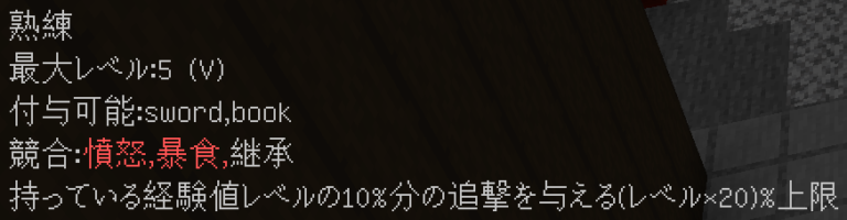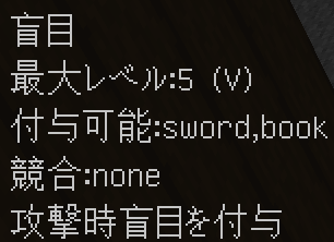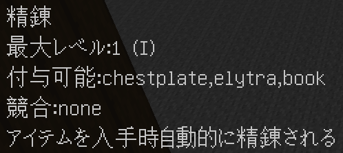このように付与されます。競合するエンチャントや付与できないエンチャントはバニラと同じように無くなり、同じエンチャントは統合され、レベルが同じ場合+1レベルされます(エンチャントごとに固有の上限有)。