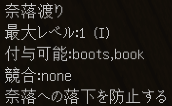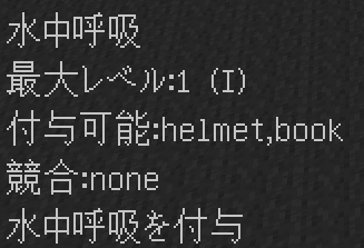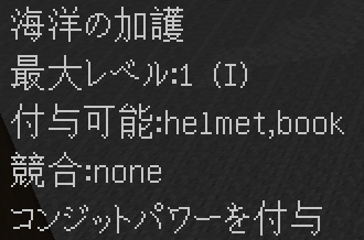 入手方法:水中呼吸のエンチャントが付与されたヘルメットを被っているかつ水中にいる場合にメインハンドにあるアイテム(ヘルメットか本)に一定確率で付与