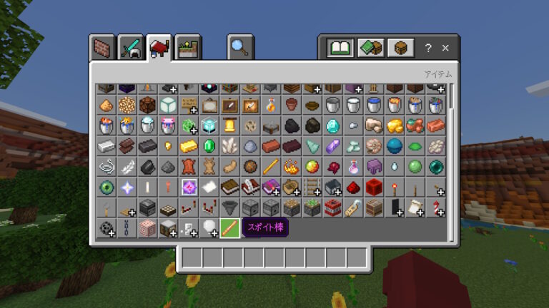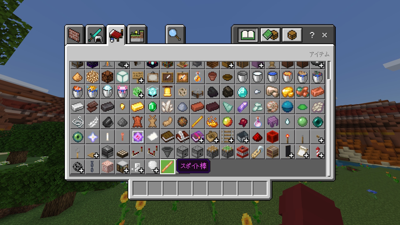 クリエイティブインベントリを開き、アイテム欄の下にある「スポイト棒」(エンチャントされたブレイズロッド)のアイテムを持ちます。