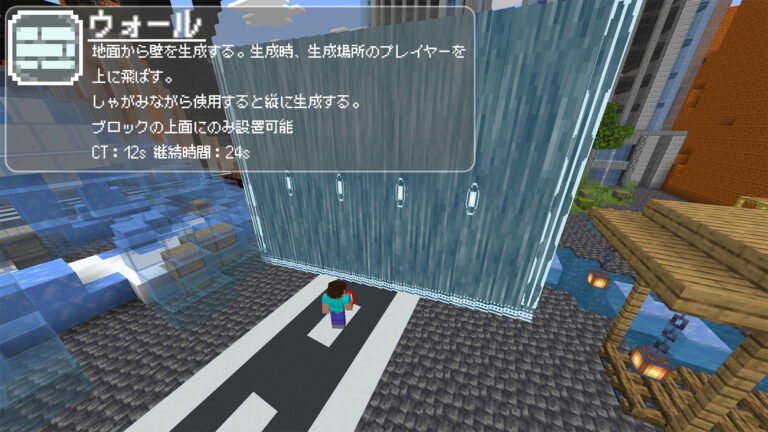 視点から距離8ブロック以内のブロックの上面にのみ設置可能です。地面からせりあがるように出現します。生成時、壁が生成される位置にいるプレイヤーは敵、味方問わず上方向に飛ばされます。