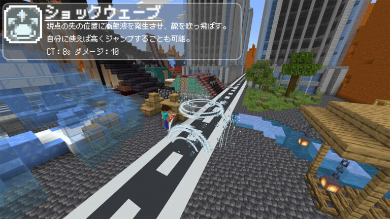 視点から距離64ブロック以内の目線の先のブロックを中心に衝撃波を発生させ、敵にはダメージを与えながら周囲のプレイヤーを吹っ飛ばします。空中での使用時、使用者が水平より30°以上、下の方向を向いていると使用者の目線のすぐ先を中心として衝撃波を発生させます。