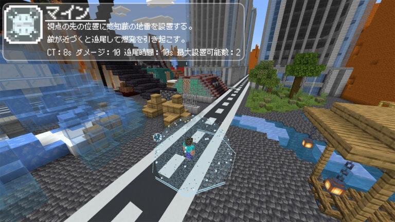 視点から距離32ブロック以内の目線の先のブロックに設置が可能です。最大で2つまで設置でき、3つめ以降は、古いものから消えていきます。ブロックや、ウォールにぶつかると即座に爆発します。設置中でも追跡中でも一定のダメージを受けると消滅します。