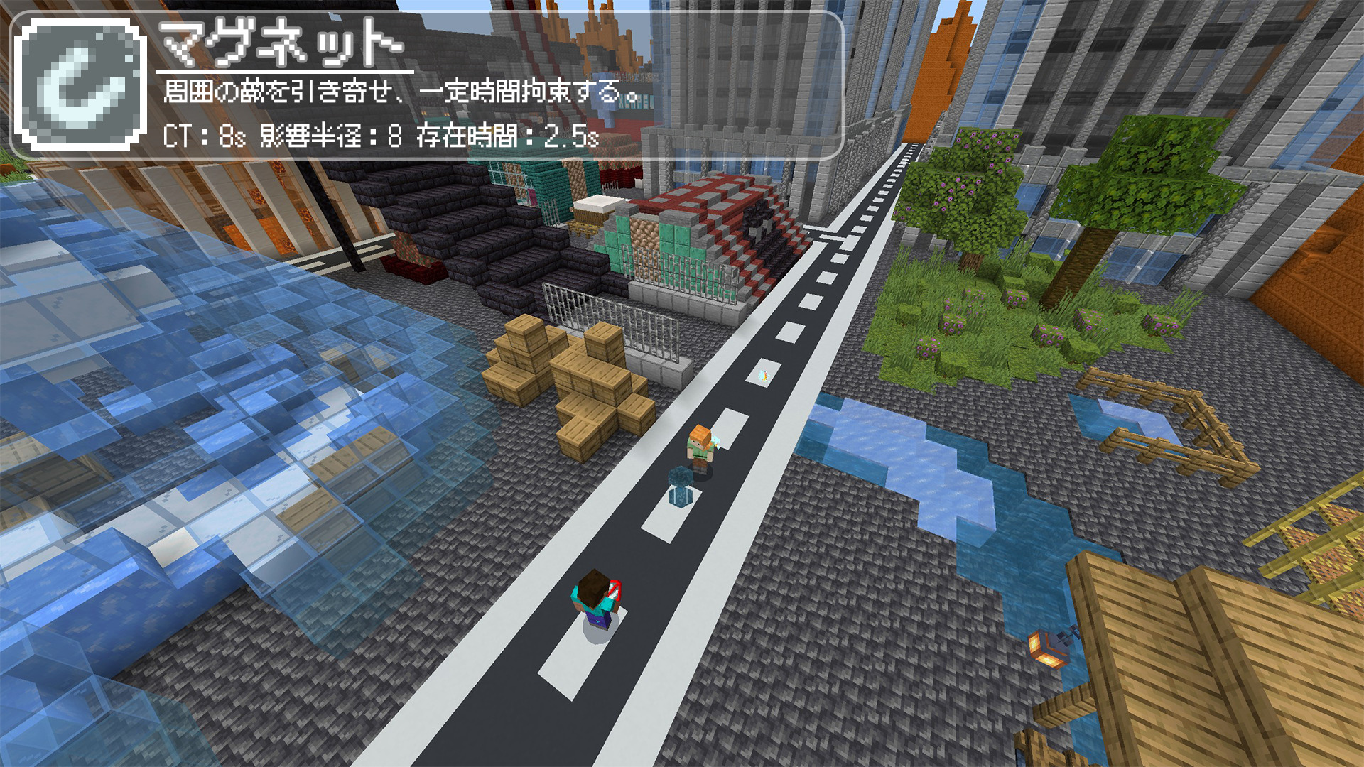 視点から距離32ブロック以内の目線の先のブロックに設置が可能です。設置場所を中心に半径8ブロック以内の敵プレイヤーを設置場所に引き寄せ、マグネットが存在する間、設置場所に拘束します。