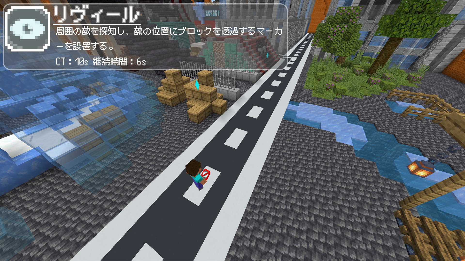 半径40ブロック以内の敵プレイヤーを探知し、そのプレイヤーの位置にマーカーを設置します。マーカーはブロックを透過して見ることができ、使用者以外にも表示されます。