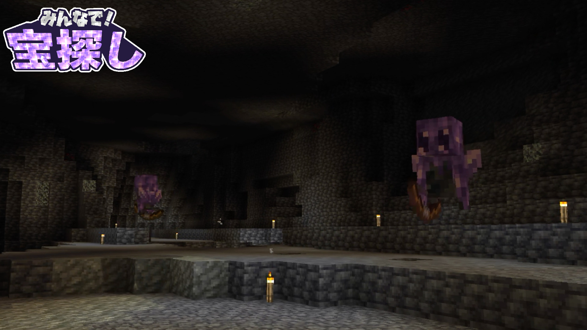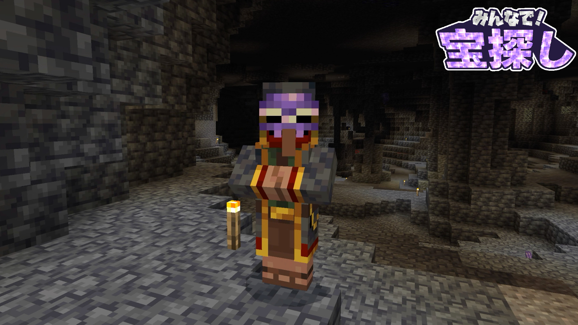 ゲーム開始時に現れる商人で、リスポーン地点で固定されています。鉱石の換金とアメジストで松明と食料を販売してくれます。
