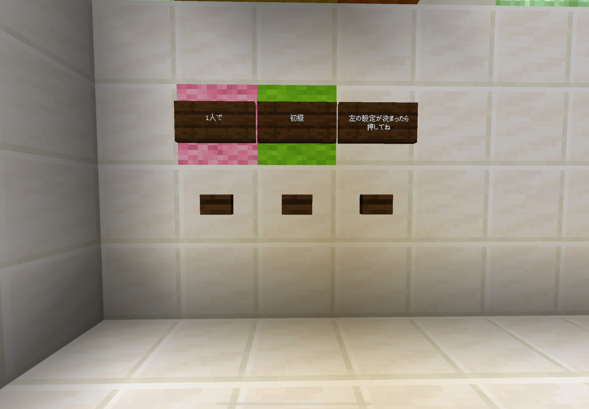 入った部屋にボタンがあるので、そのボタンを押すと上にある看板が代わり、「一人で」か「みんなで」どちらをやるか決めます。