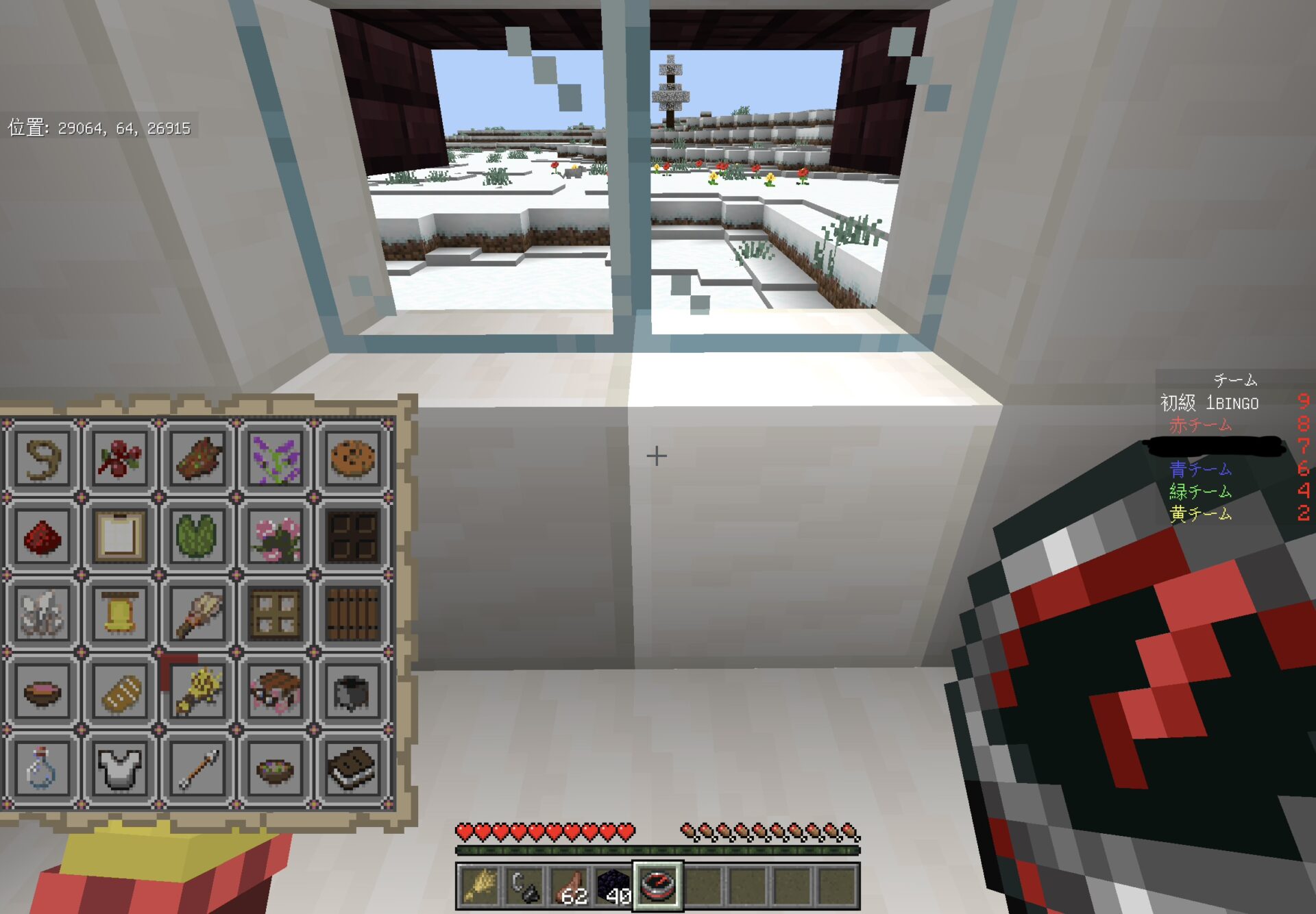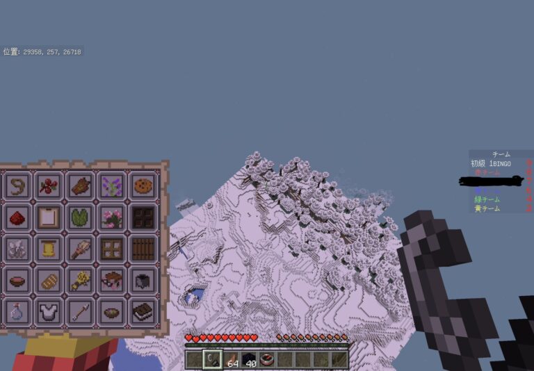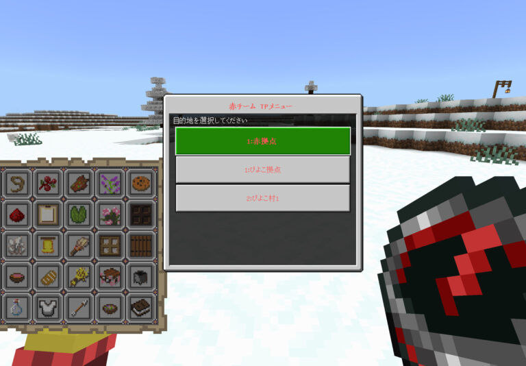 スタートボタンを押したら、各チーム拠点に飛びます。同時に「BINGOカード」と「火打石と打ちがね」と「食料」と「黒曜石」と「特殊カラーコンパス」(後でできることを説明します。)が配布されます。