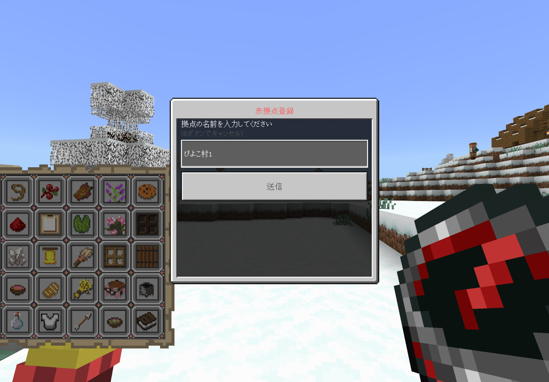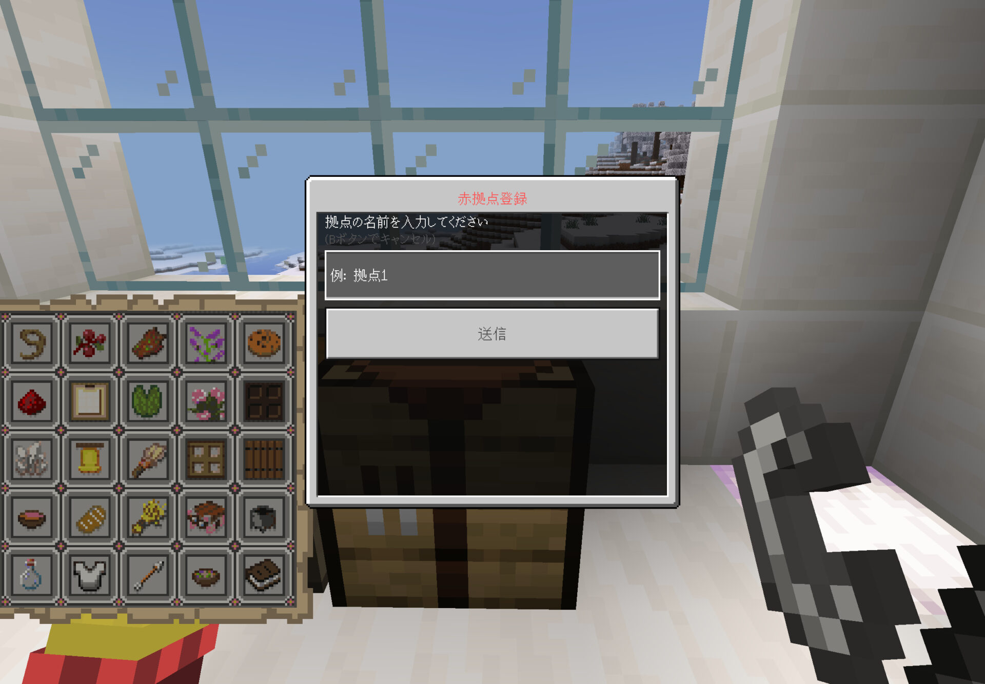 これを押すと、テキストが画面が出てきます。拠点名を決めて送信を押すとその場にサブ拠点が建築されます。