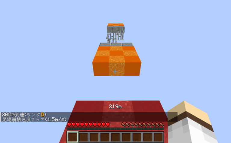 失敗したら即座にゲームオーバーとなる状態で、無限に生成されつづけるアスレチックに挑むというマップです。足場がランダムに生成され、進むとだんだん後ろから崩れていきます。クリアというものは存在しません。到達距離が自動で計測され、DからSまでのランクがつけられるので、自分の納得する記録を目指して挑戦しましょう。