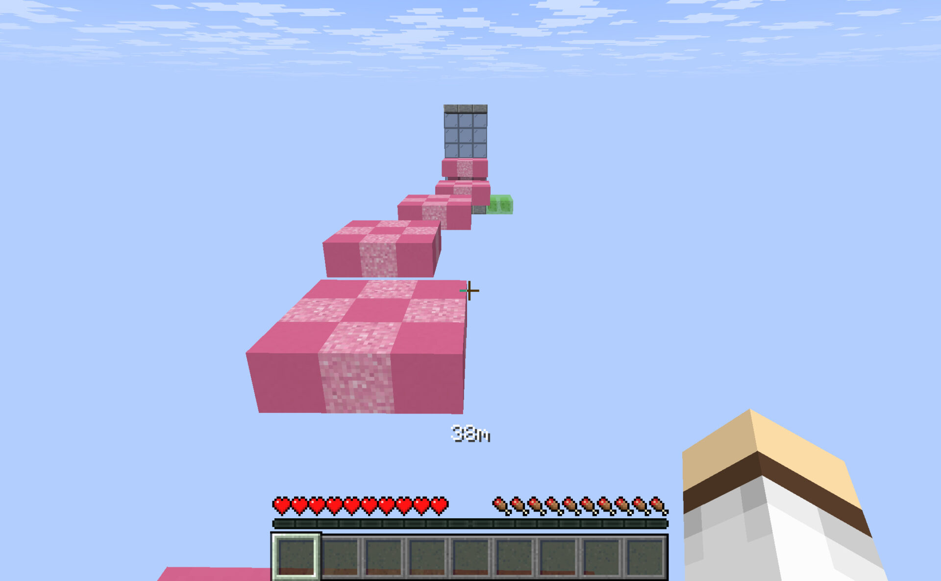 失敗したら即座にゲームオーバーとなる状態で、無限に生成されつづけるアスレチックに挑むというマップです。足場がランダムに生成され、進むとだんだん後ろから崩れていきます。クリアというものは存在しません。到達距離が自動で計測され、DからSまでのランクがつけられるので、自分の納得する記録を目指して挑戦しましょう。