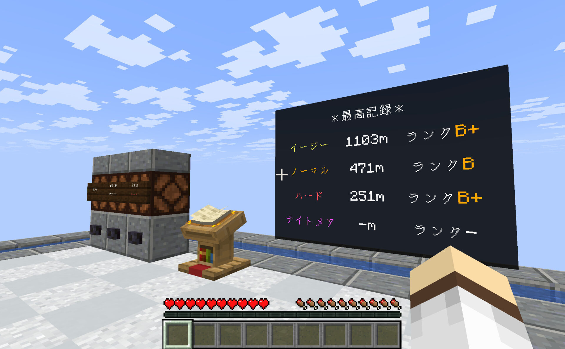 制作者の最高記録は3012m(イージー)/1708m(ノーマル)/632m(ハード)/232m(ナイトメア)です。好記録が出た方はぜひ教えてください。