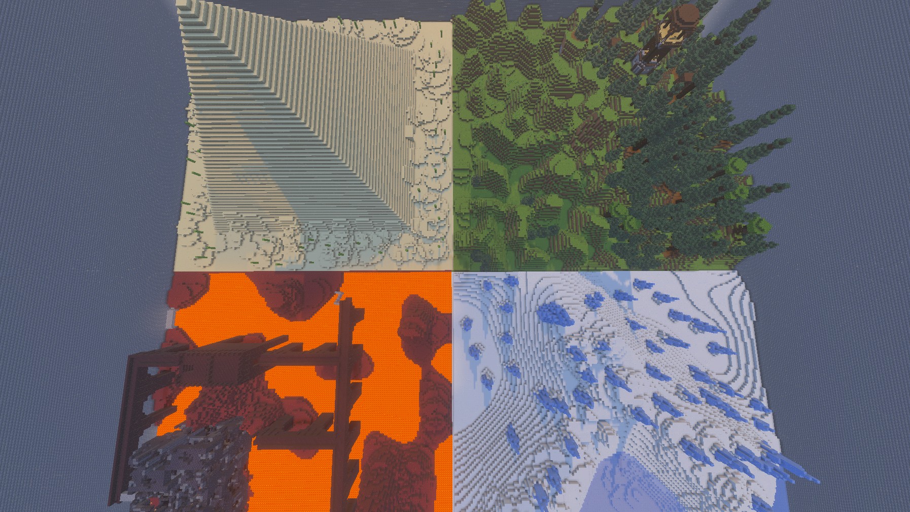 フィールドは森林、砂漠、雪原、ネザーの4つの区画に分かれている。この区画は時間によって閉鎖され、閉鎖された区画にいるとダメージを受けてしまう!