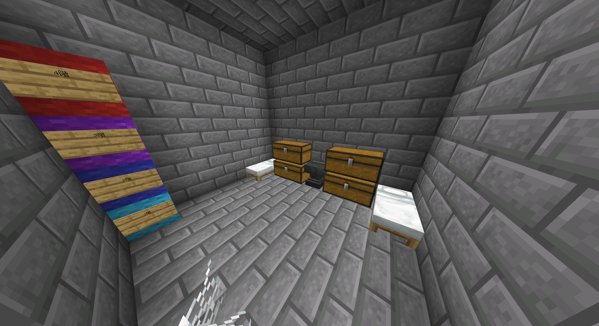 前回はいろいろと守り側専用ルートなどが複雑になっていてわかりにくかったので、守り側通路に各階への行き先の看板と色分けをしておきました。これで前よりは迷わなくなったとおもいます。