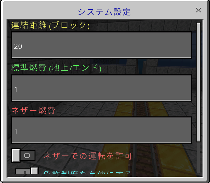 • 各種設定: 連結可能な距離、ワールドごとの燃費、ネザーでの運転許可などを設定できます。