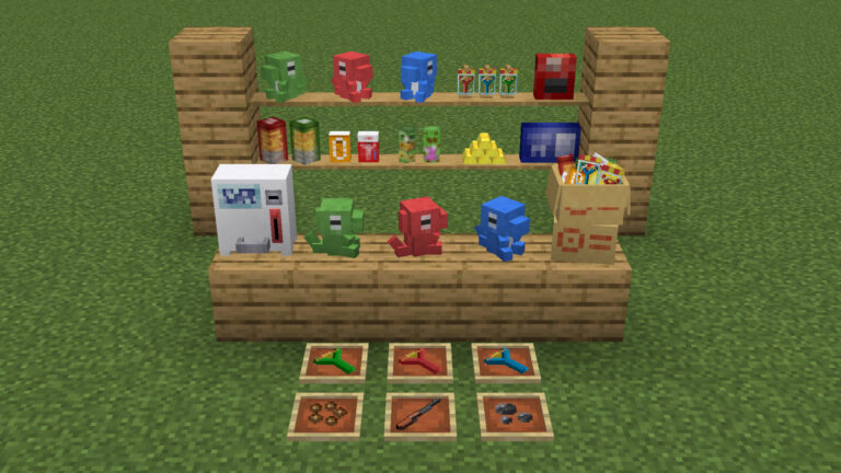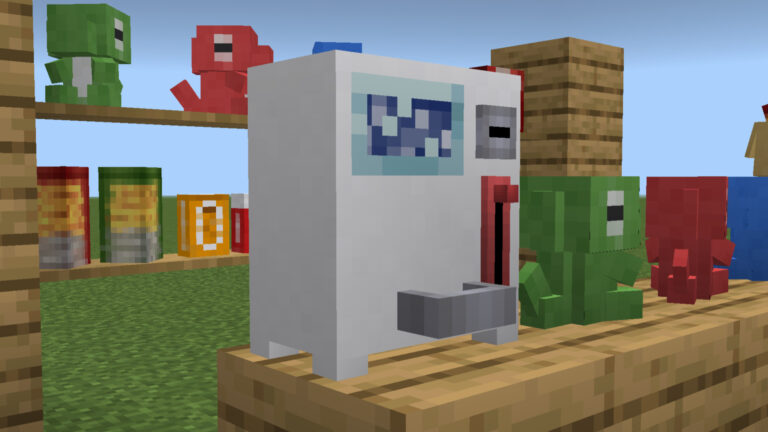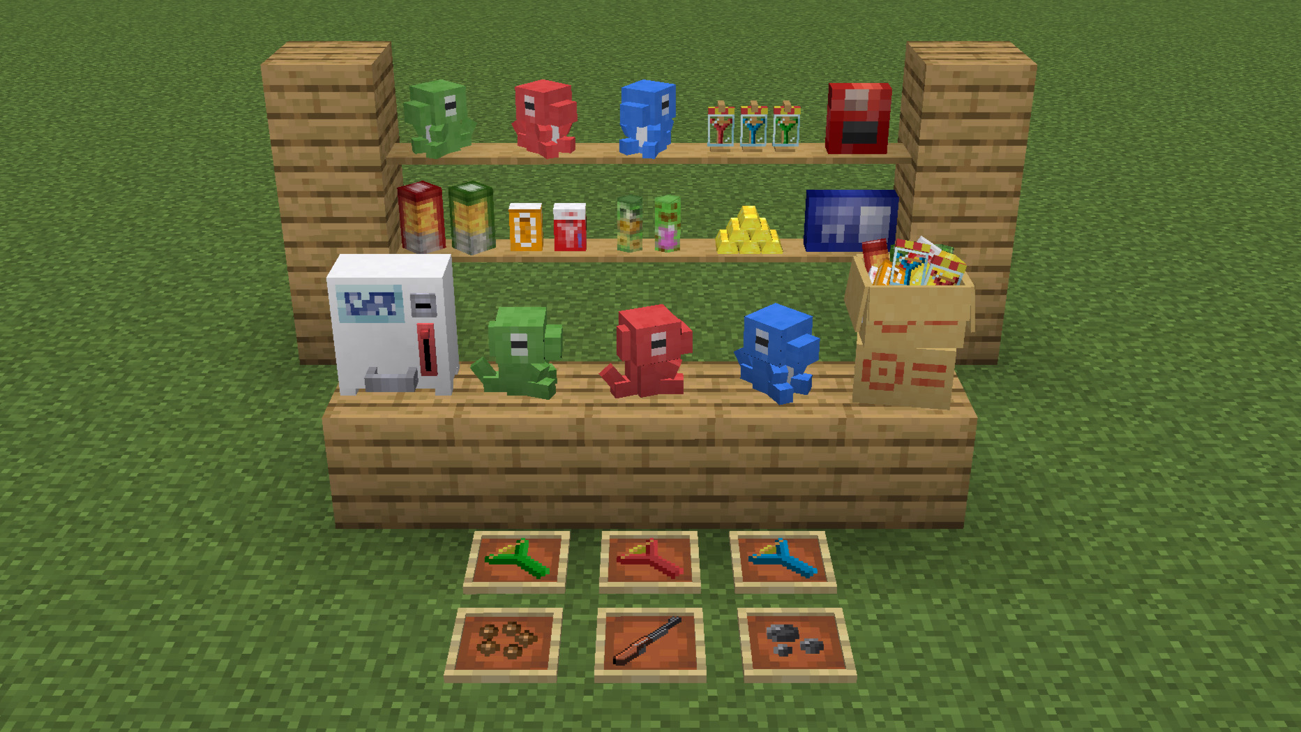 射的銃を使いコルク弾で撃つことで、いろいろな景品が出る射的のミニゲームを楽しめます。景品には特別な便利隠しアイテムもご用意しましたので是非コンプリートしてください!また、スライムブロックや吸着ピストンなどにも反応しますので、アイディア次第で動く的にも挑戦できます。