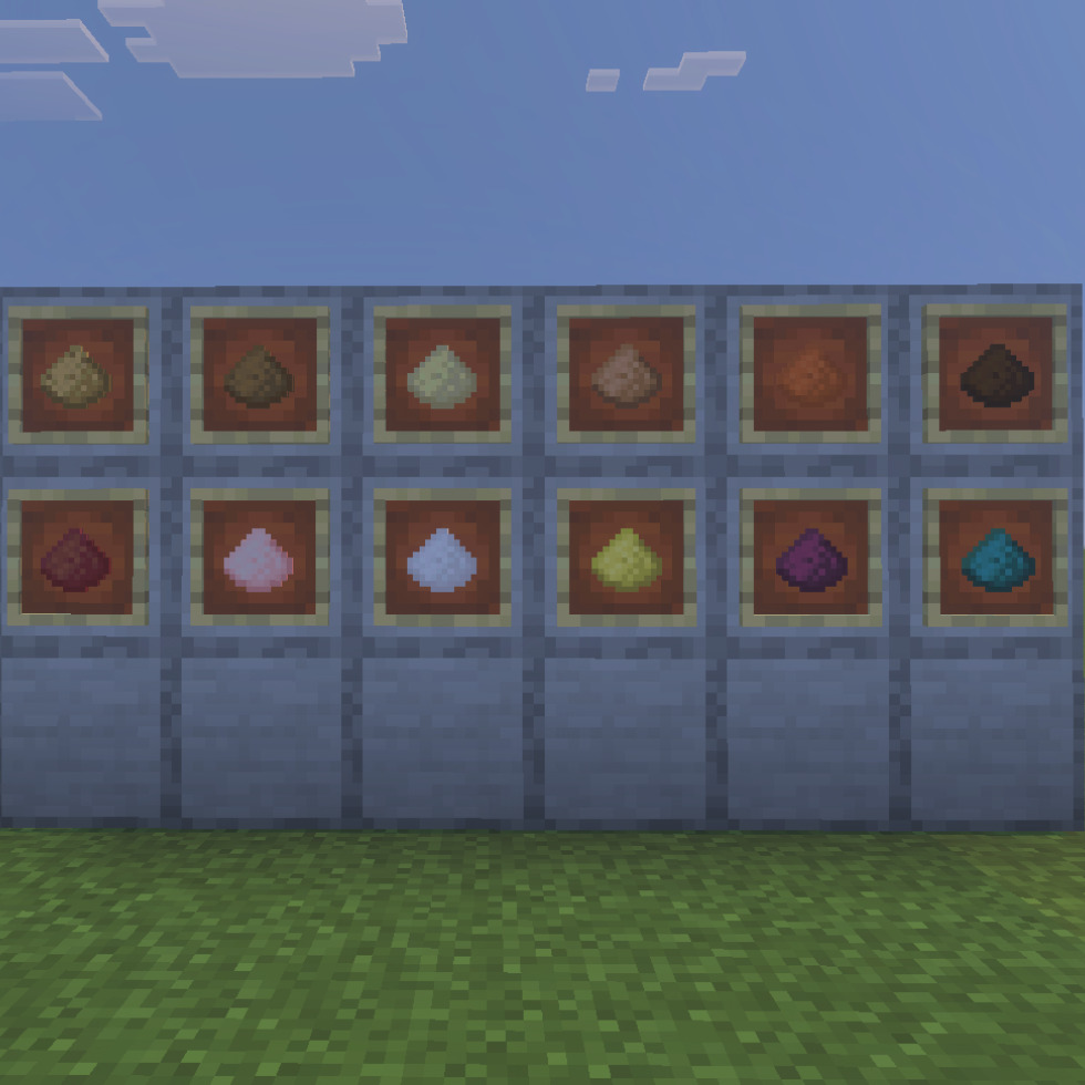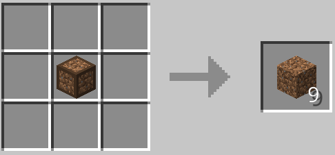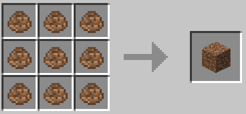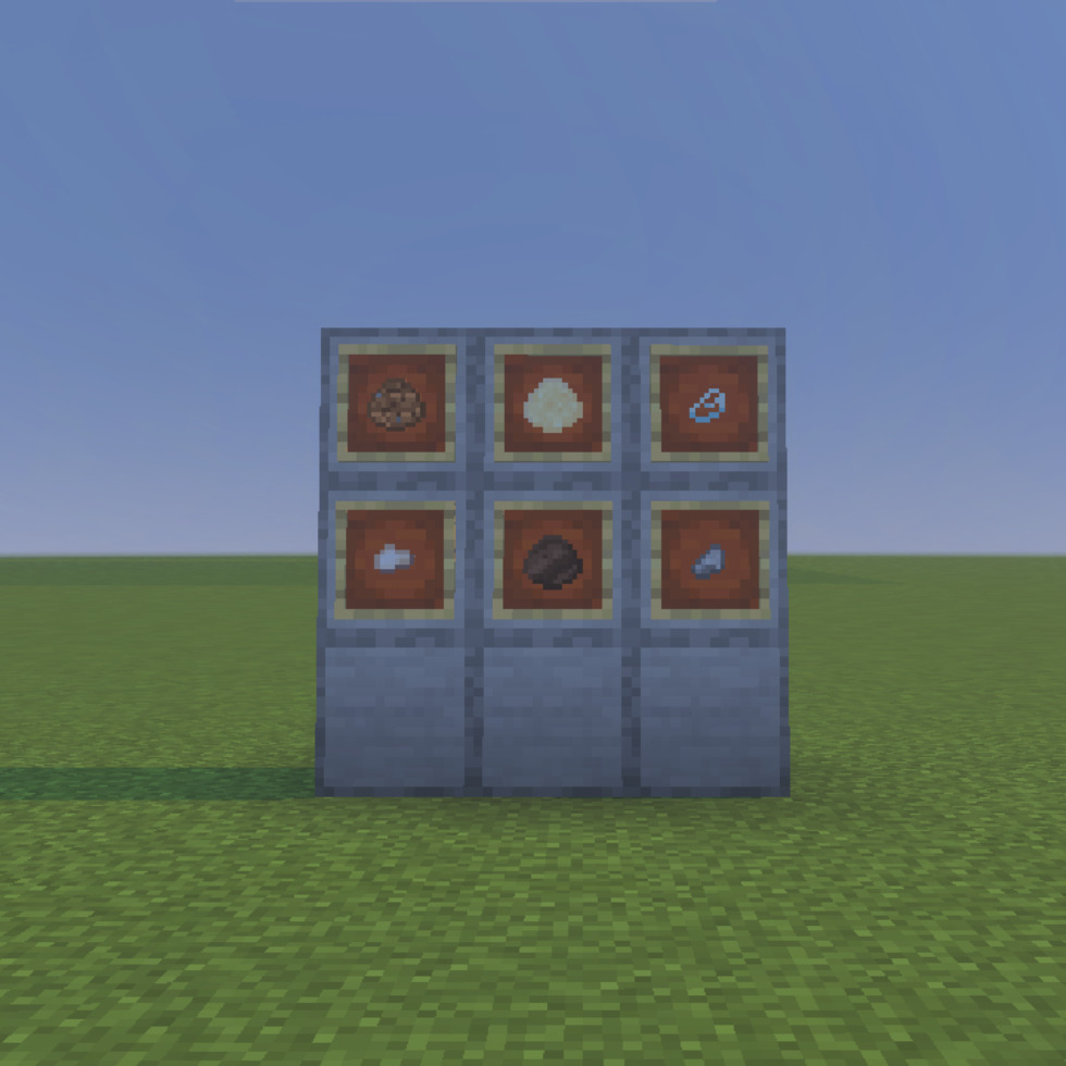 基本的に篩から集めることができ、9個集まると対応したブロックやアイテムになる。