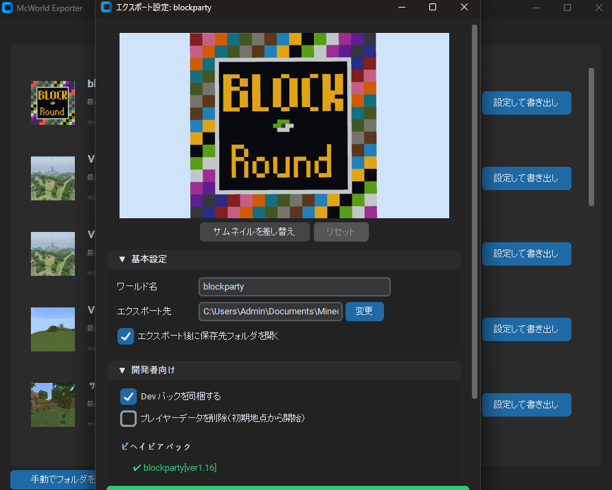 通常版・プレビュー版・エディタモードそれぞれのワールドを一か所からエクスポートできます。