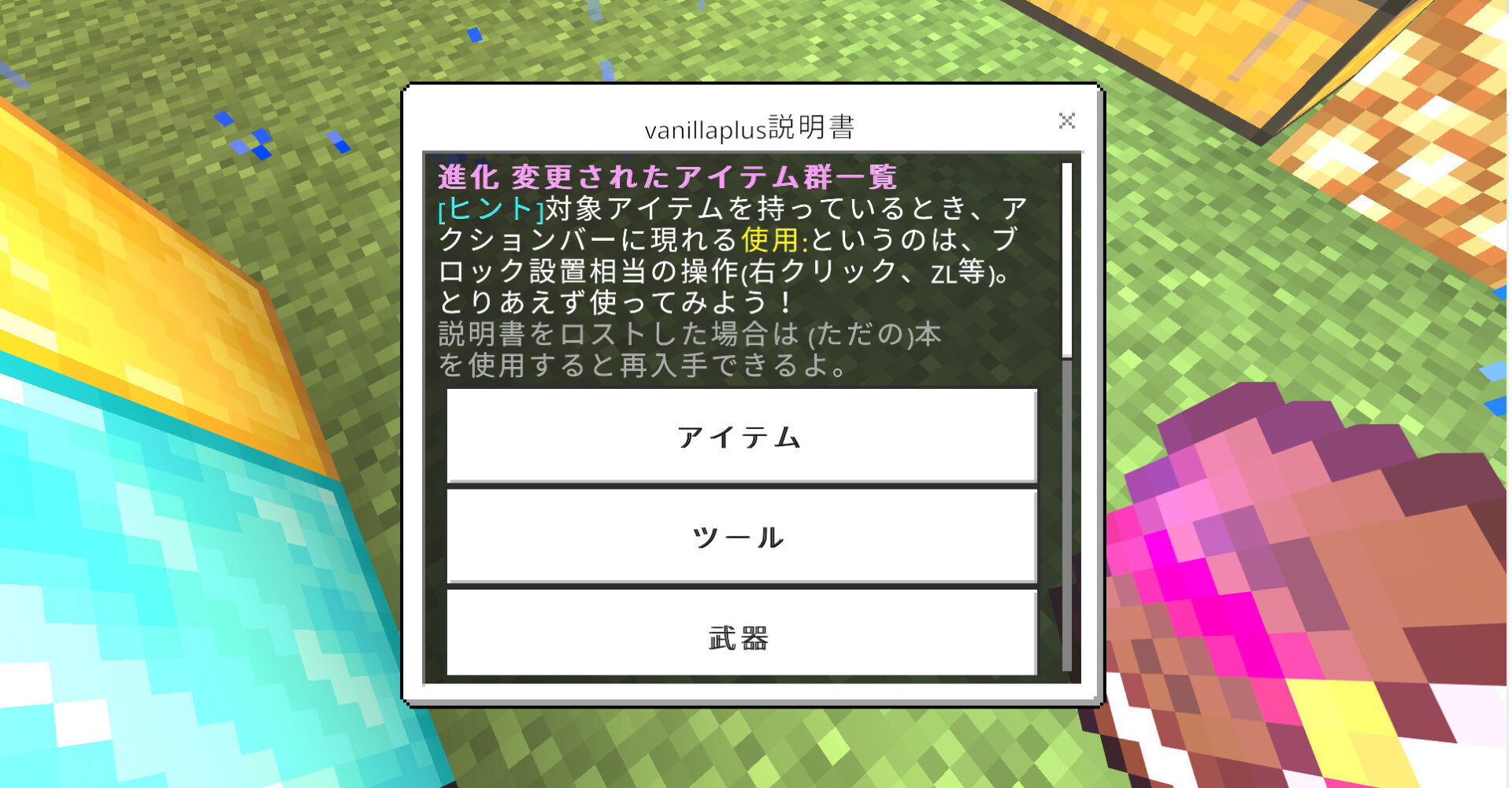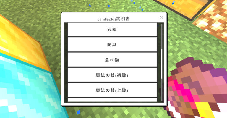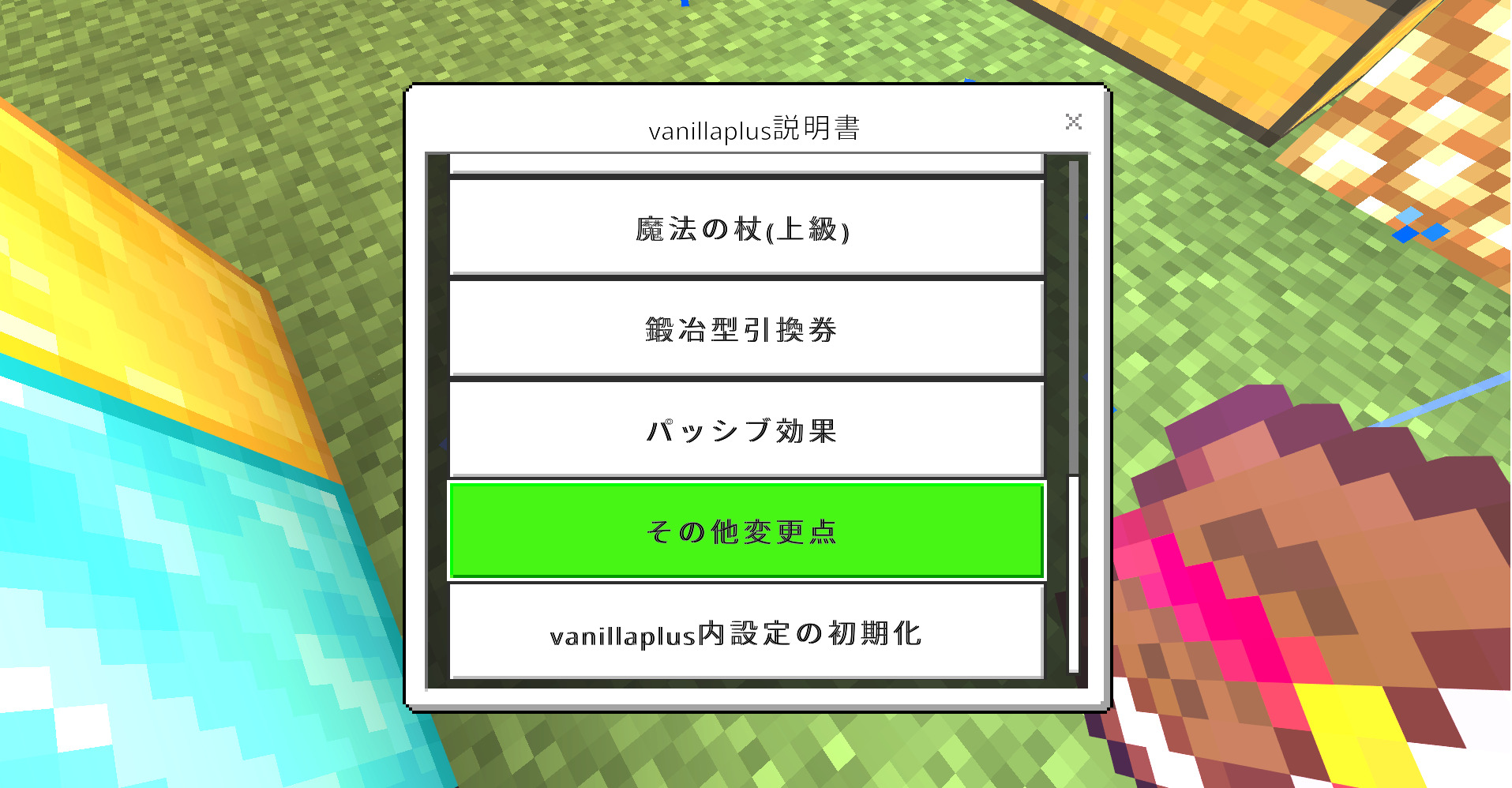 以前のバージョンを入れてくれている方は、一旦前のバージョンを削除してから再度導入、配布されている説明書の一番下の vanillaplus内設定の初期化 を選択してから再度遊ぶと不具合なくできると思います。