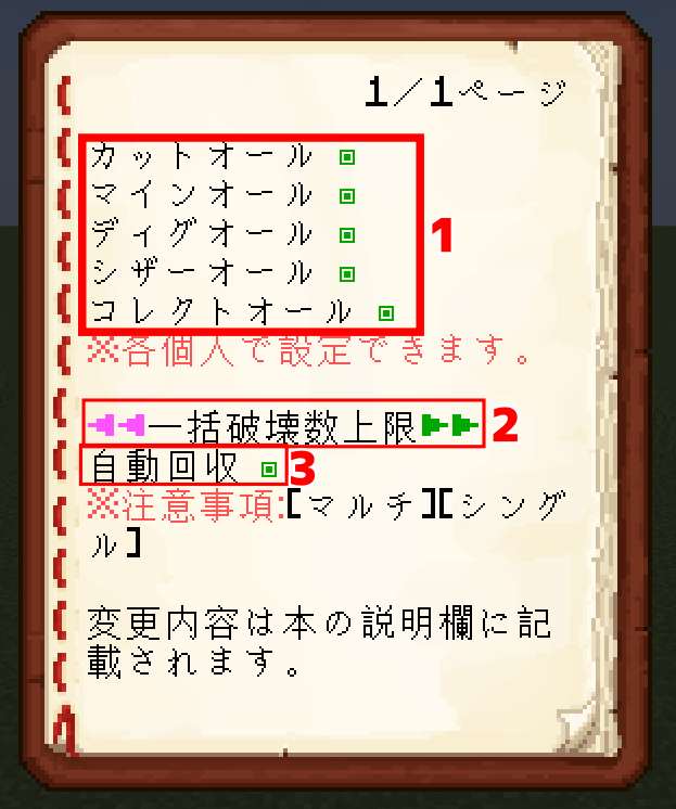 1.カットオール(斧)、マインオール(つるはし)、ディグオール(シャベル)、シザーオール(はさみ)、コレクトオール(クワ)のON/OFFを個別に設定できます。(デフォルトは全てオフ)